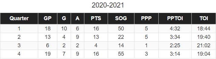 Boeser’s production was incredibly consistent throughout the season, with his PPG shifting only slightly from quarter-to-quarter. That’s especially worthy of discussion because Boeser’s own playing situation varied wildly throughout 2021, particularly when it came to linemates.