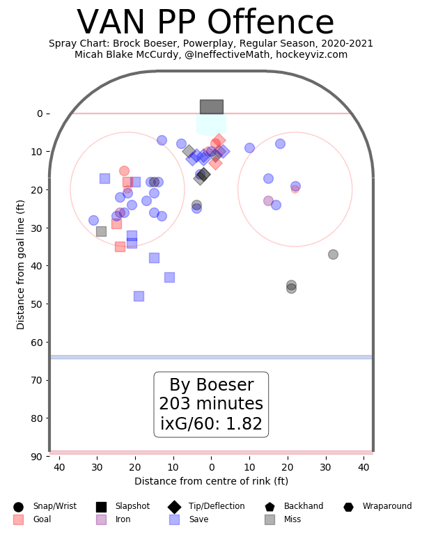 His sizeable uptick in shooting percentage might have some worrying about puck-luck and possible regression, but it’s not quite as stark a difference as it looks. Boeser shot at 16.2% in his rookie season, 12.4% the year after, and all the way down to 9.5% in 2019/20. So, again, it’s really more of a comeback than an uptick, and it’s reasonable to expect his shooting percentage to remain in the early-to-mid-teens for the foreseeable future.