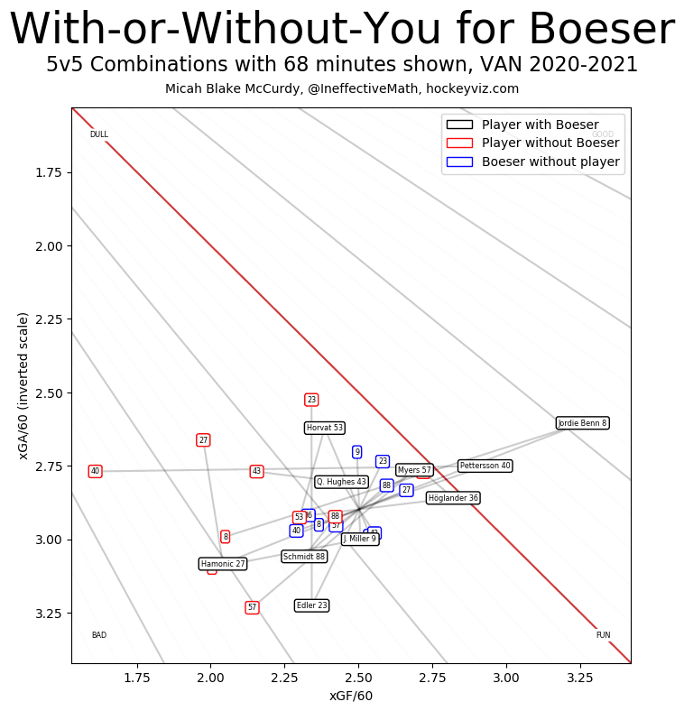 The same is true of JT Miller. Boeser’s xGF was actually higher without Miller, but Miller’s sank by almost 8% without Boeser.