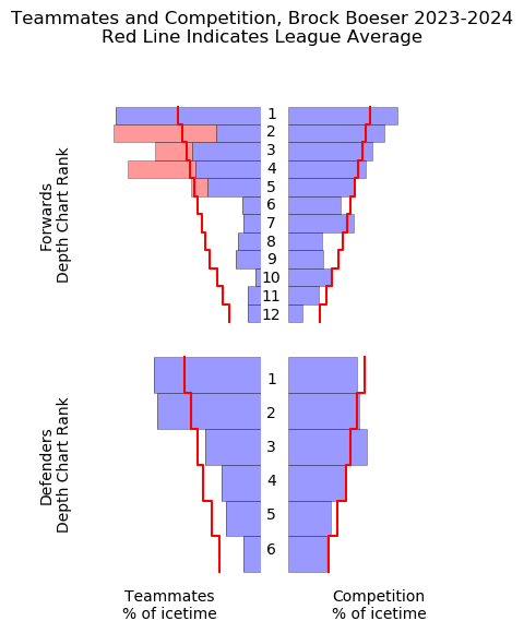 What makes Boeser’s defensive performance in 2023/24 really stand out is the context. He and his linemates still control a good chunk of play, and have only let in three goals against, while facing a deployment chart that looks like this: