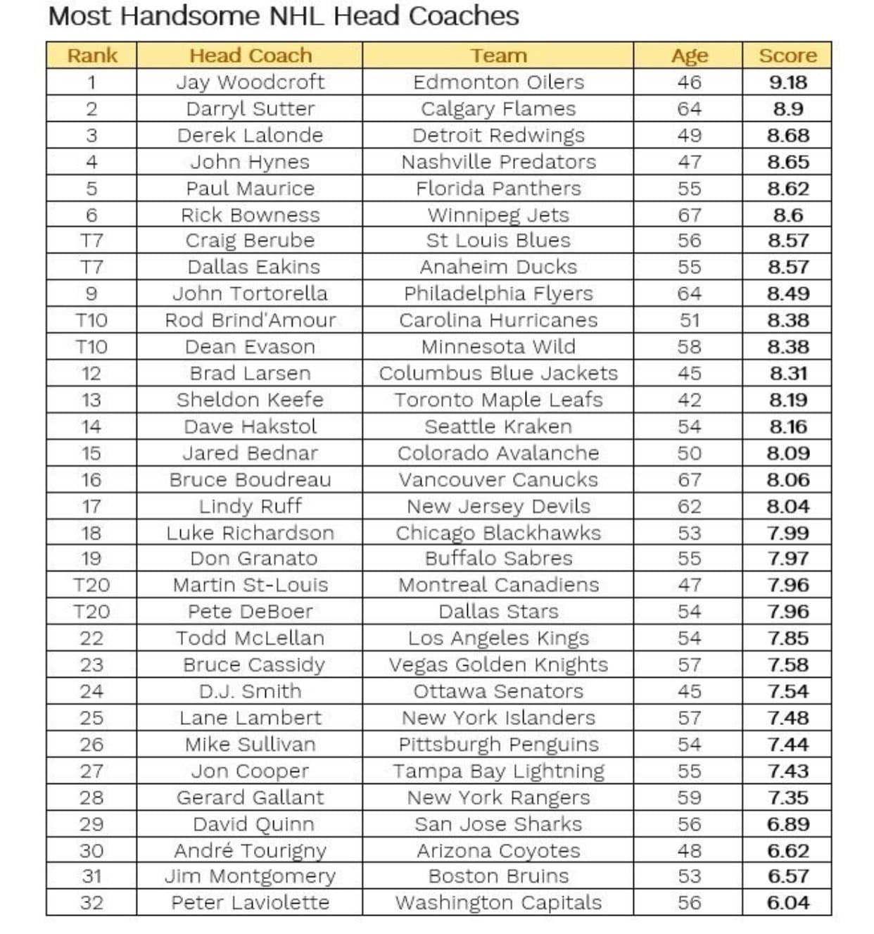 A report by gambling.com ranked all 32 NHL head coaches based on results provided by a beauty measuring app called Golden Ratio Face.