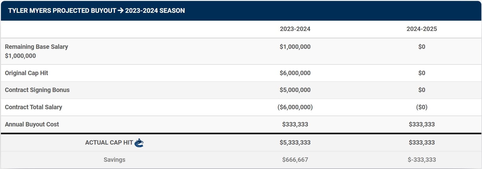 Because of that $5 million signing bonus still to be paid, if the Canucks were to buy out Myers’ contract this summer, they would still be hit with a $5.33 million hit for the 2023/24 season. That’s a savings of just $667K, followed up by a $333K penalty the following year. There’s just no scenario in which that’s worthwhile, especially when burying Myers in the minors would literally result in more cap space and no penalty.