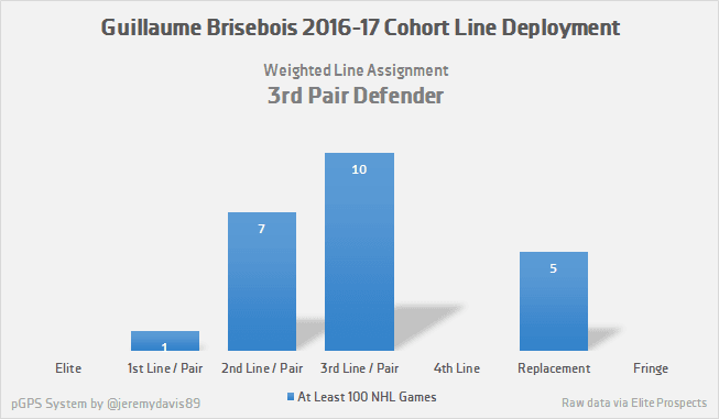 The analytics-vs.-eye-test trope is such a tired one that it feels lazy to cite it, but Brisebois is exactly the type of player that magnifies the divide between “hockey men” and the pocket-protector crowd. What sets him apart from the type of players that usually cause this rift, however, is that he isn’t particularly mean or physical. In fact, in some ways, he’s the type of player that’s often overlooked by the mainstream at the NHL level. For whatever it’s worth, Chris Tanev is frequently cited as a player comparable, and he’s not exactly a bruiser.