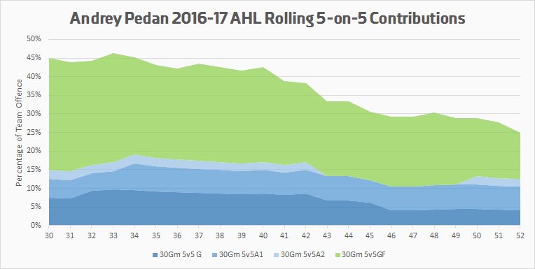 Over the course of the season, the percentage of the Comets’ offence for which Pedan was on the ice plummeted, a sure sign in leagues that don’t release TOI information that a player’s TOI is falling.