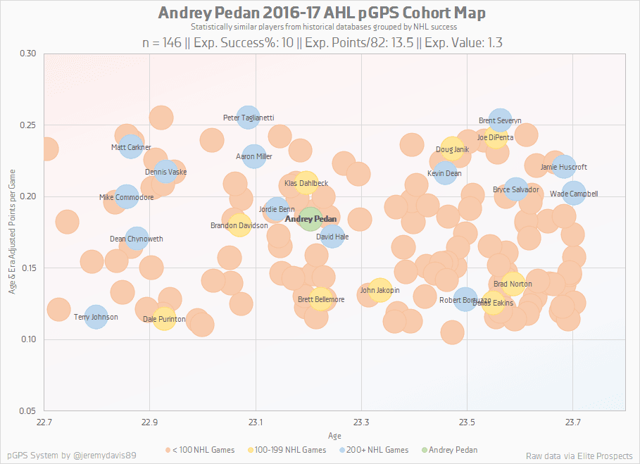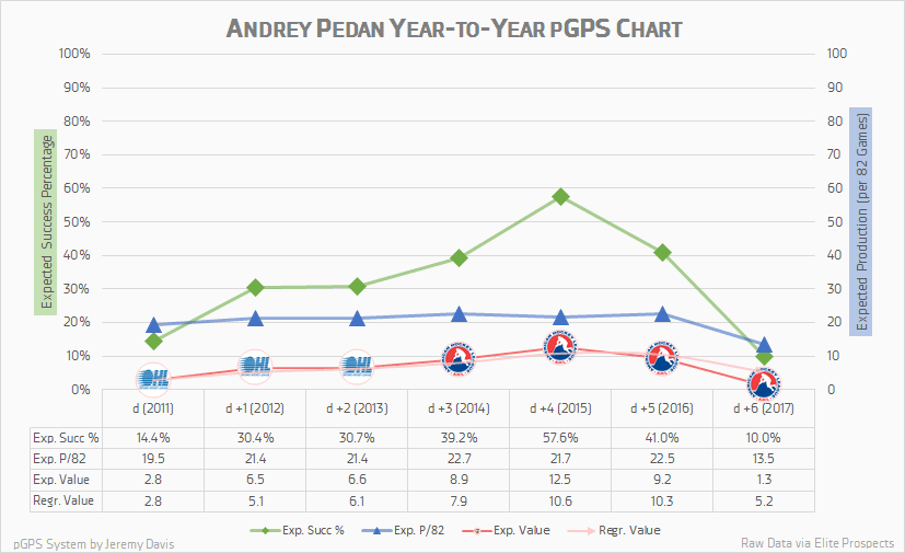 Pedan’s lack of production has translating in a lack of faith from pGPS, our in house prospect projection model. Despite the size that has typically aided him in this regard (NHL insiders have loved them some big defenders, paving the way for an increased projected rate of success), Pedan’s expected likelihood of success fell to just 10% in 2016-17, the lowest it had ever been since playing in pGPS certified leagues.