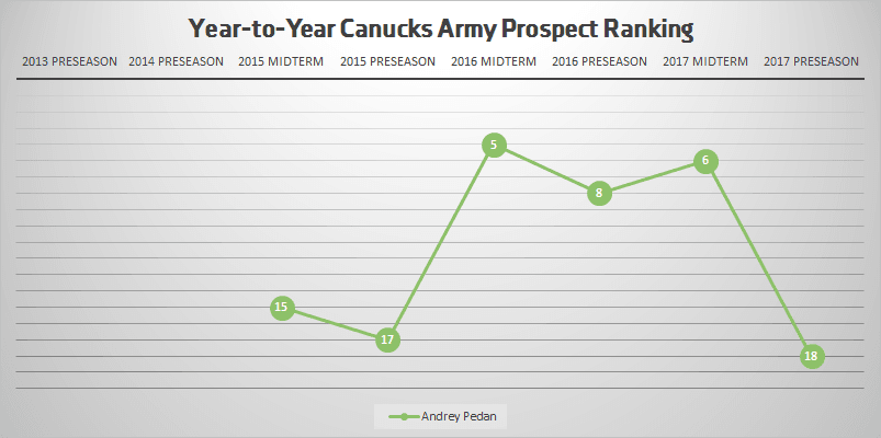 Andrey Pedan has had a tough couple of seasons. After being brought into the Canucks organization in 2014, he rose to become one of the Canucks’ best defensive prospects. But instead of seeing what they have in Pedan, his time on the NHL roster has mostly been squandered. Now, after a tumultuous season and flagging production numbers, Pedan’s stock is on the decline. After being ranked eighth before last season and sixth during the midterm rankings, Pedan has tumbled all the way to 18th in our prospect list.