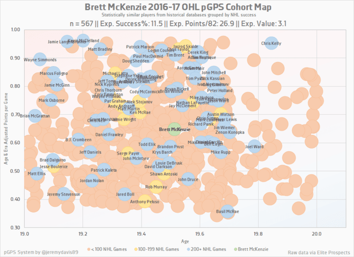 From a traditional perspective, there’s a lot to like about McKenzie. He’s got an NHL-ready frame at 6’2″ and 192 pounds, which he uses effectively. He’s also an adept skater, using speed and lateral movement to create space rather than using his size to attempt to bowl over opponents. While some of his goal-scoring ability can be attributed to taking advantage of OHL goaltending, McKenzie isn’t afraid to go to the tough areas, and scored the majority of his goals from high-percentage areas of the ice. While he doesn’t have high-end offensive upside, he doesn’t have any glaring weaknesses either, and it’s easy to envision a future as an NHL role-player. He’s also reliable and effective in his own zone, for whatever that’s worth at the junior level. In other words, he’s fairly nondescript forward prospect, but there’s some precedence for success that here that should definitely be noted.