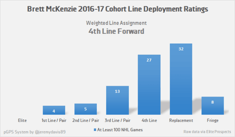 The numbers tell the same story, more or less. McKenzie holds a respectable 11.5% expected success percentage via the prospect Graduation Probabilities System. The vast majority of McKenzie’s successful cohorts were either bottom-sixers or replacement-level forwards, but a few managed to become legitimate impact players in their teams’ top six, including Wayne Simmonds and Logan Couture, although it should be noted that both players scored at a much more prolific rate than McKenzie.