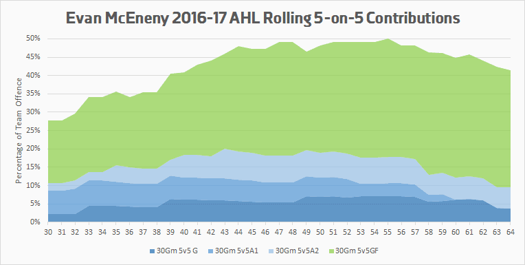 It’s fairly common knowledge that I’ve been outright obsessed with the Utica Comets for past years, so I don’t think it’s overly immodest to suggest that I saw McEneny’s rise to prominence coming. Even as his point production was just beginning to tick upwards, what really stood out was how Travis Green was using him. By and large, coaches are very reliable evaluators of talent and ability (with the occasional biased exception), and when a coach begins giving a player more and more responsibility, it’s often a good indicator of actual improvement.