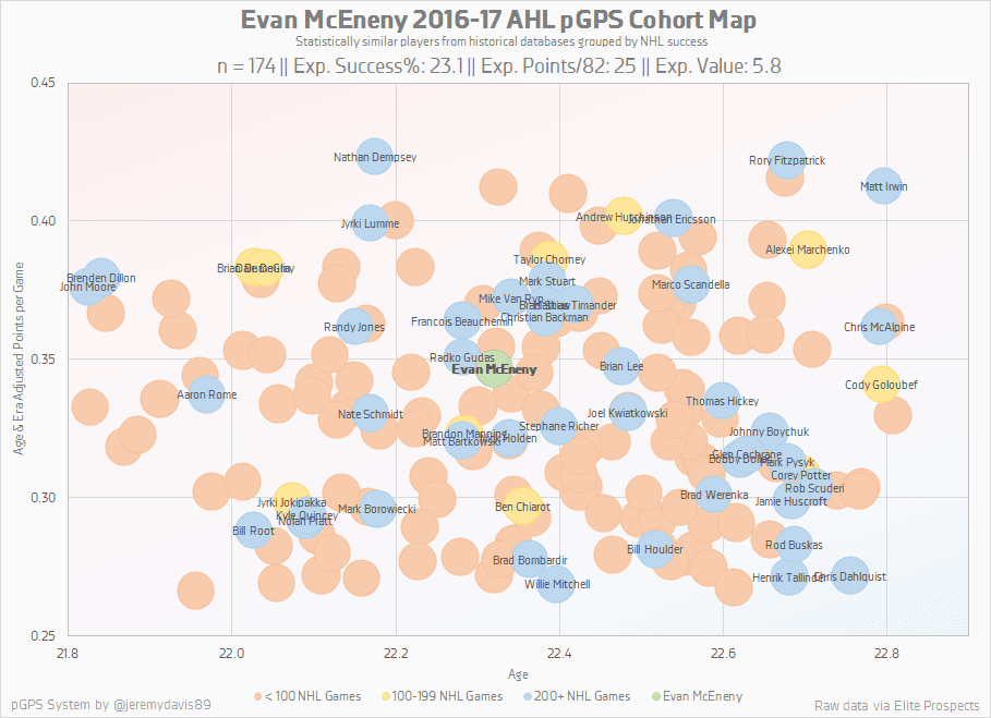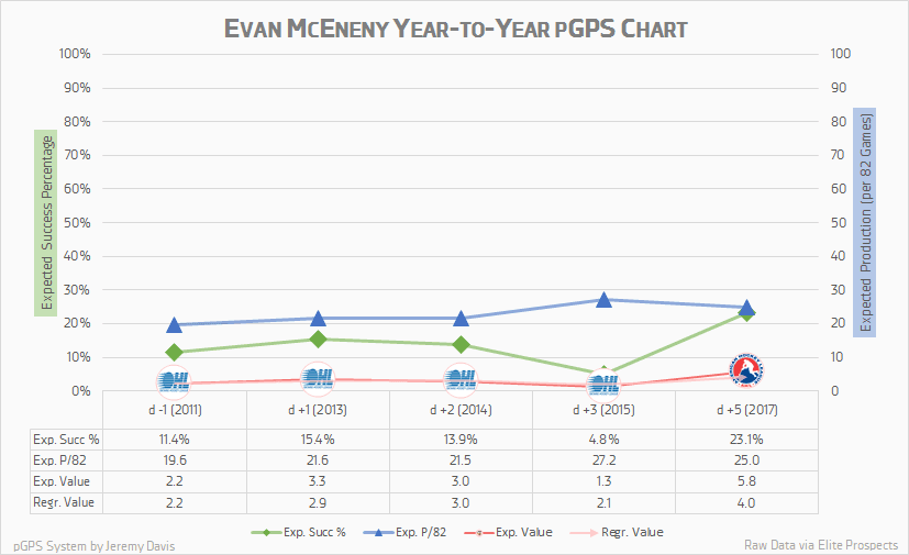 The results of the season boosted McEneny’s likelihood of succeeding at the NHL level, jumping up to a pGPS expected success rate of 23%, which is all the more impressive given how unproductive the first third of his season was (pGPS is only taking into account his season-ending statistics). Some of McEneny’s 2016-17 comparables are Francois Beauchemin, Jyrki Lumme, and Nick Holden.