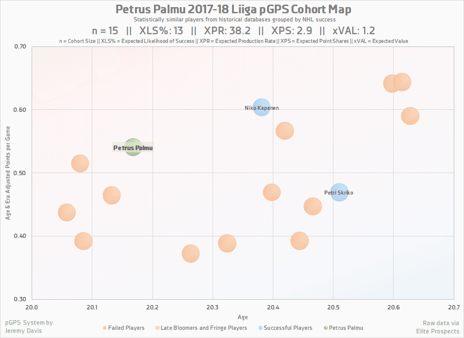 In spite of his impressive rookie season, Palmu still looks like a long shot to make the NHL when viewed through the lens of the prospect Graduation Probabilities System (pGPS). Based on pGPS, Palmu has an expected likelihood of success of 13%. While this may not seem impressive, it’s great for a sixth round pick especially considering his upside and the Canucks scouting department deserves full credit for unearthing him. Real Canucks heads will notice that one of Palmu’s successful matches is Petri Skriko, who was a good player on a very lackluster Canucks team in the ’80s. While the scoring rates pGPS uses to determine matches are adjusted for era, pGPS still undersells Palmu’s likelihood of success, if only because NHL teams seem more willing than ever to take chances on shorter players.