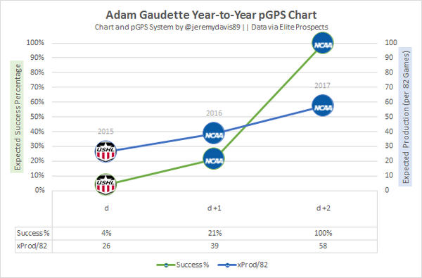 When the Canucks selected Gaudette in 2015, there was some concern about him merely because he was limited to 30 points (13-17-30) in the USHL. Using the PCS draft model (which has since left this space), Gaudette checked in with 1.6% of his comparable statistical players becoming NHL regulars. As we can see above, pGPS shows that number to be about 4%.