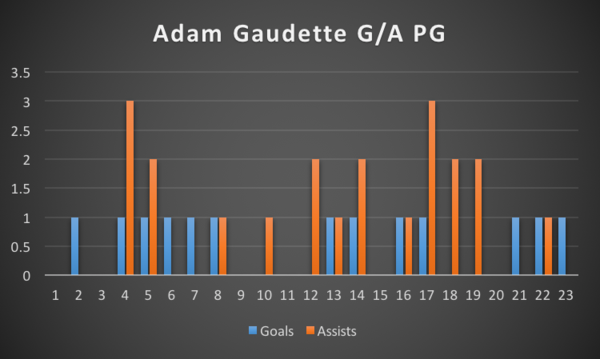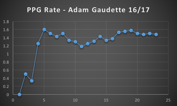 The easy conclusion to draw was that Gaudette caught fire as Northeastern started to take off, and he would see a bit of a drop off in his stats in his sophomore season. His 0.73 PPG last season has risen to 1.48 PPG so far this year.