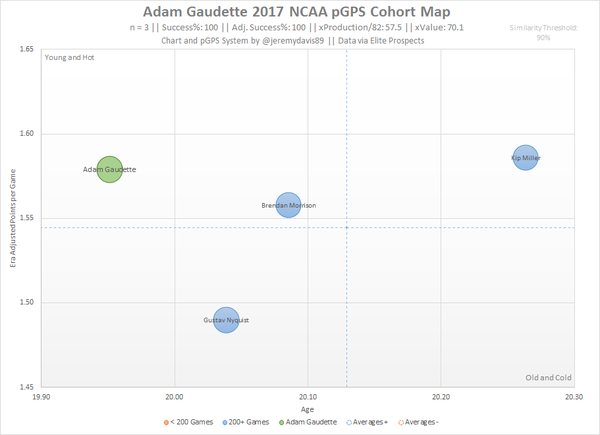 First off, I sat on the pGPS data for about ten days before completing that profile on the 2015 draft class — so it was slightly outdated. But the rise of 42.1% of matches to 100% is due to Gaudette slightly increasing his production rate, dropping off the comparable players that were below 1.45 PPG (in era-adjusted scoring). Those players dropped off the ‘unsuccessful’ matches which left just Brendan Morrison, Gustav Nyquist and Kip Miller. All three of those players have played more than 200 NHL games, hence the 100% success rate.