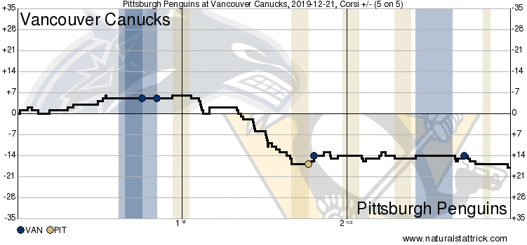 The second period wasn’t so kind to the Canucks on the shot clock as the Penguins peppered Jacob Markstrom for over 20 shots while Vancouver managed five. If Markstrom isn’t in on this one, the Canucks may have turtled: