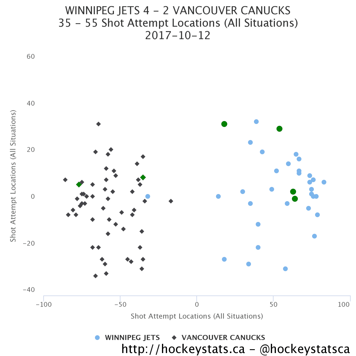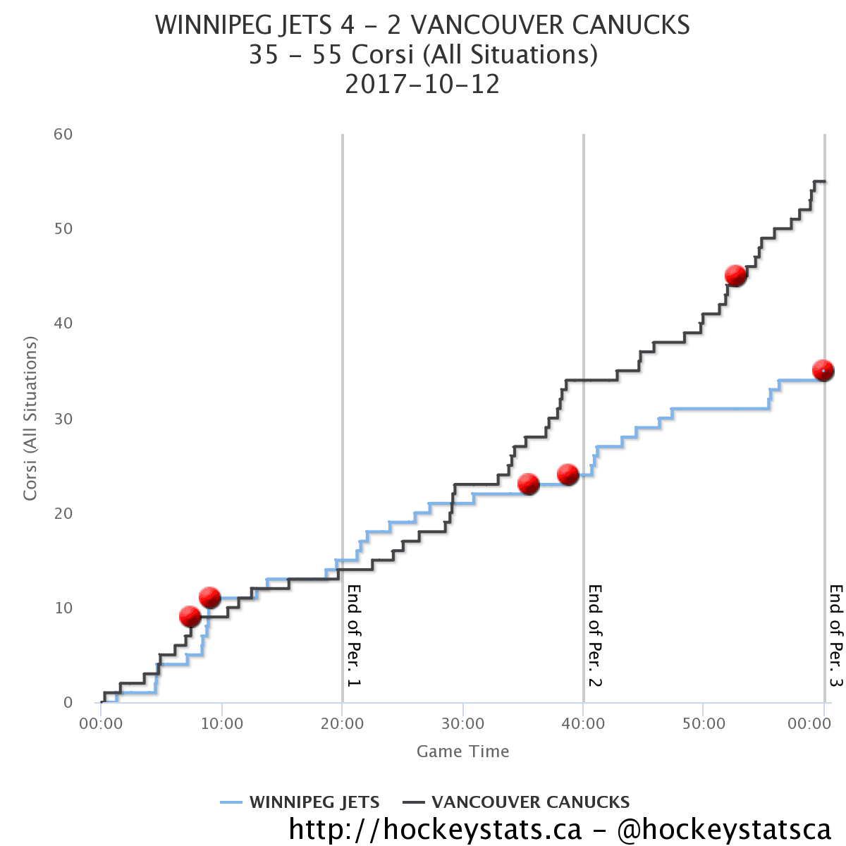 - Chris Tanev let out an uncharacteristic lazer of a shot to beat Connor Hellebuyck top-corner and put the Canucks within one late in the third. It seems like every offseason we hear about the work Tanev is putting in on his shot, and it looks like maybe it’s finally paid off. He’s currently tied for the team-lead in goals, because the first few games of the season are always a little weird.