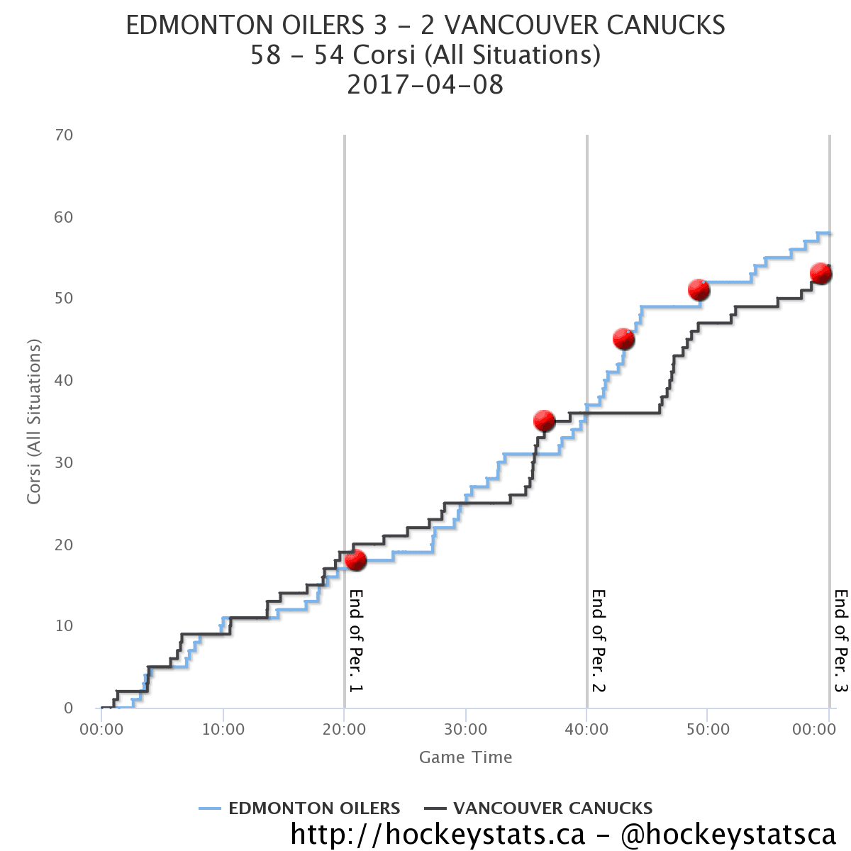 - The Sedins had another rough game, controlling only a third of shot shares at even-strength. Midway through the second period, The Canucks spent two full minutes hemmed in their own zone, broken up only by an icing call, and the Sedins were mostly at fault for the sequence. I’m of the belief that they can bounce back in a big way next year with the right linemates and a reduced role, but watching them struggle so much down the stretch has been disconcerting.
