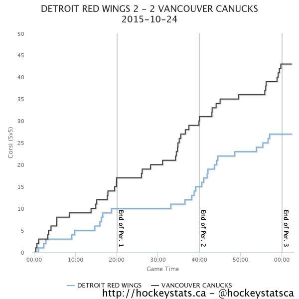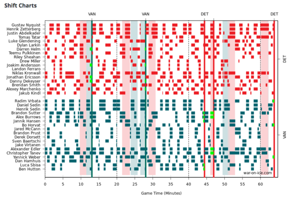 Things became decidedly less fortunate for Vancouver from this point onward. They continued to dominate play, entering the third the handily better possession and neutral zone team, but with little in the way of a lead to show for it. As the chances mounted and the results floundered, the oncoming threat of a Red Wings comeback hung ominous over Vancouver.