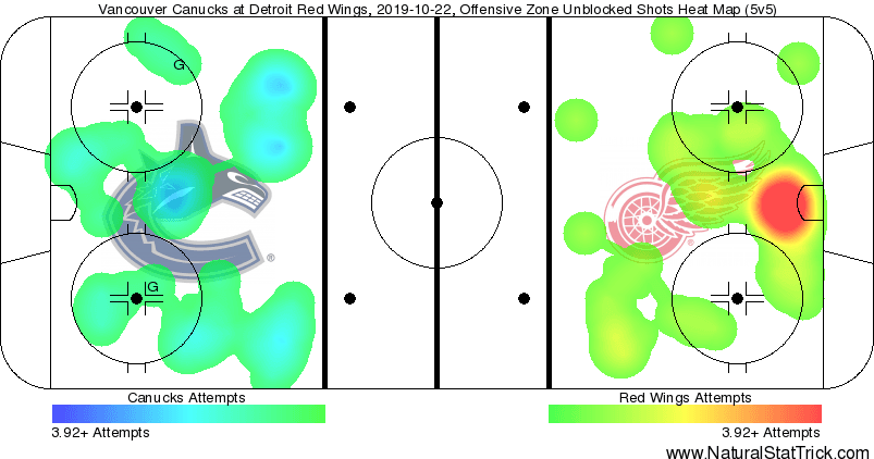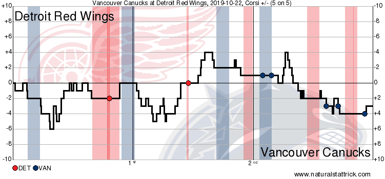 Tonight, the Canucks looked discombobulated against a very poor Red Wings squad for long stretches throughout the first two periods, struggling to clear the zone effectively and get set up Detroit’s end. The regression we expected to see on the penalty kill finally began to take form tonight, as the Canucks gave up two power play goals to the Wings in each of the first two periods, first on a 5-on-3 and later on a 4-on-3.