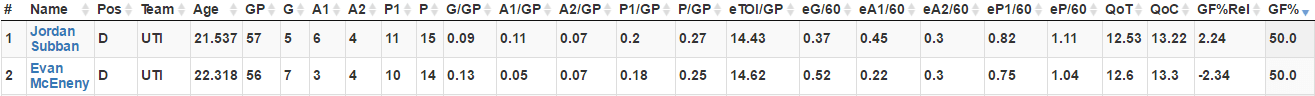 The data that Botchford is referring to here is basically on ice goal-differential. Both Subban and McEneny were 50% GF% players at 5-on-5 at the time the piece was written. Subban, however, had a slight edge in terms of relative GF%.