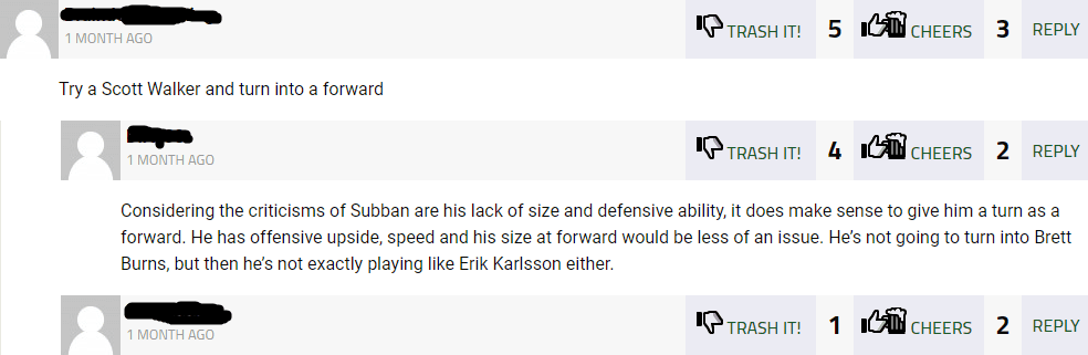 It also presupposes that moving someone from the position at which they’ve played for the majority of their hockey playing career is something you can just do at the drop of a hat. Sure, it worked for Brent Burns and Dustin Byfuglien, but they are truly elite players. I think the world of Subban, but he simply isn’t that. The next time you hear somebody bring this up, take it as an invitation to tune out. It’s a very good indicator that the person you’re speaking to has no idea what they’re talking about.