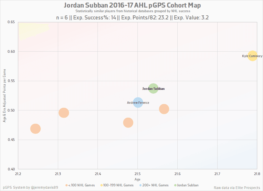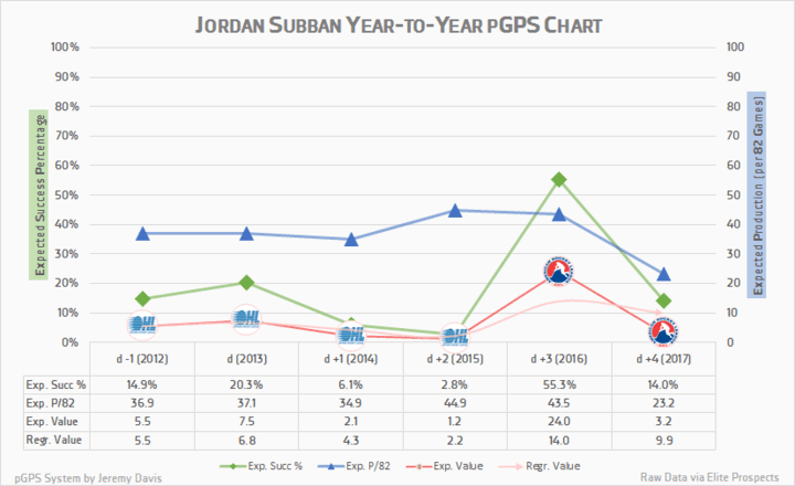Draft analytics paints a somewhat underwhelming picture of Jordan Subban, who now carries an expected success percentage of just 14.1%, down significantly from the numbers he’s posted in previous editions of our prospect rankings. Out of six matches, Subban’s only successful cohort was Andrew Ference.