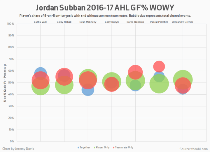 That doesn’t mean Botchford’s point isn’t without merit, though. Subban may be an adventure in his own end, but he was also a positive GF%rel player at 5-on-5 this year. Even if he’s turning the puck over on a constant basis, it hasn’t resulted in his team being outscored relative to his teammates. That’s an important bit of context, because it indicates Subban’s offensive capabilities may be enough to make up for the areas in which he struggles. More importantly, his contributions on the man advantage are enough to make him a net positive for his team, at least at the AHL level.