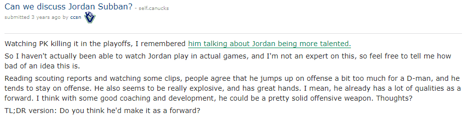 Perhaps the most weirdly persistent myth about Jordan Subban is that he should be moved to the wing. In fact, that idea is even more widespread than I had originally thought.