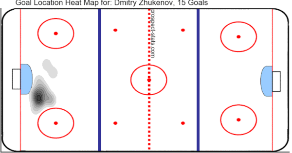 As an offensive fixture, Zhukenov isn’t without a diverse toolkit. He doesn’t have a particularly strong shot, but he makes up for that with his unrelenting drive to the “dirty areas”, as evidenced by the heat map of his goals. The extent to which his heat map for goals scored is within one part of the dangerous scoring chances area is almost comical.