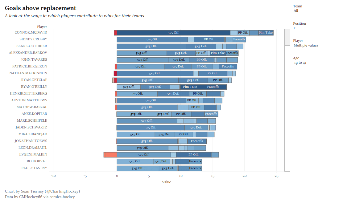 Perhaps most telling of Horvat’s impact is his team-leading goals above replacement mark. That 13.3 goals added per 82 games average is good enough to slot into the top 20 among all NHL centres.