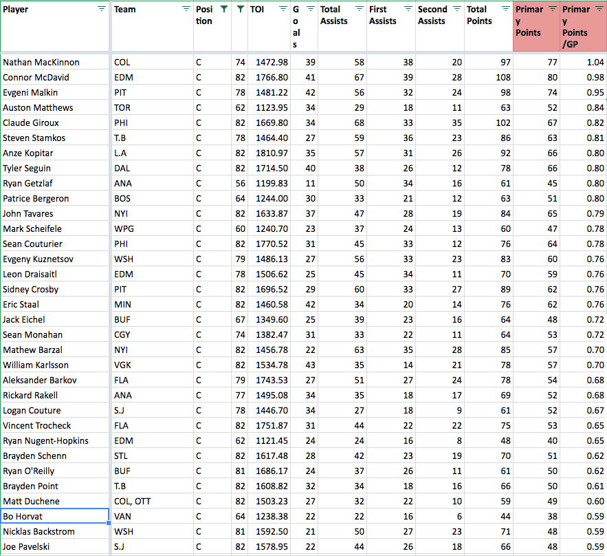 Take it a step further to look at primary points per hour and Horvat slides into the top 20 with 1.62.