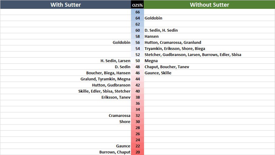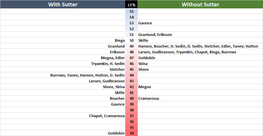 The only forward on the Canucks roster who didn’t find themselves giving up a greater differential of shots against when playing regularly with Sutter was Jayson Megna and, well.. I don’t think I need to do much convincing to sell you on the idea that playing with Sutter is a better bet than being played with Michael Chaput, Joseph Crammarosa, or being completely out of place and unable to keep up with the Sedins. Alex Biega also sees a slight uptick, but it’s not significant and it may have more to do with who he was paired up with on the point.
