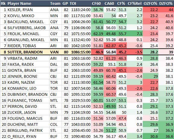 That’s not a complete and total get out of jail free card, though. Looking at other forwards in the league who put up big minutes and got frequently stuffed in the defensive zone, Sutter is still the biggest relative anchor of the group and manages to do so while playing for a team that was already getting its lunch handed to them on the whole. Other shutdown specialists manage to turn their bad situations into good ones by generating offence, a gear that Sutter just didn’t have this year and often doesn’t.