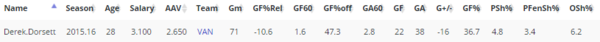 While his Corsi metrics were improved upon, Dorsett’s goal metrics were amongst the worst on the team. Some of this is luck driven, as Dorsett’s on-ice save percentage was lower than normal. Overall, the Canucks fared significantly worse when Dorsett was on the ice compared to when he was on it.