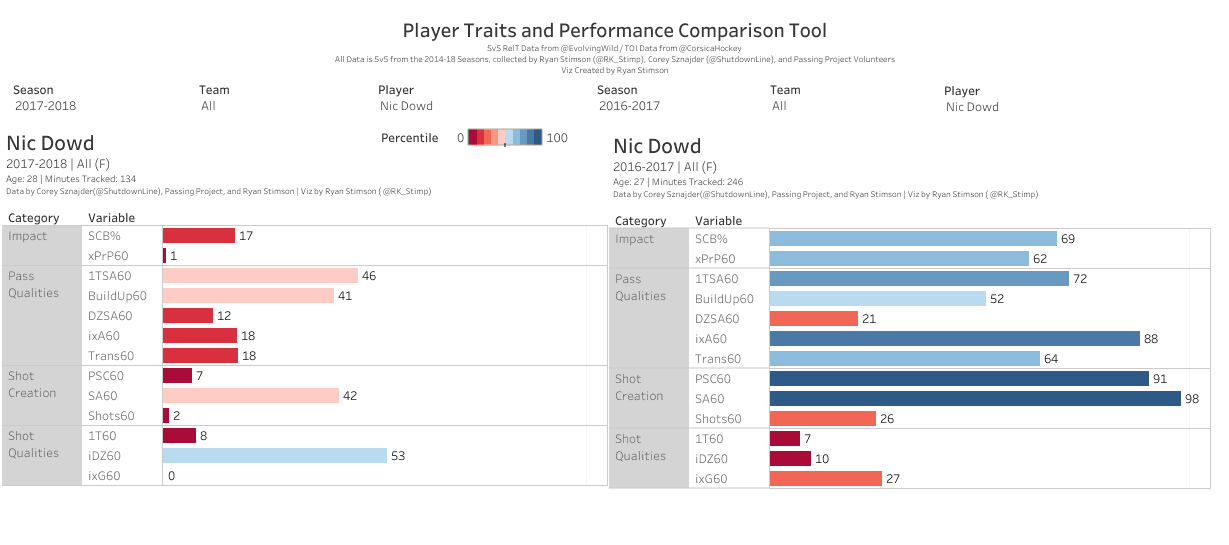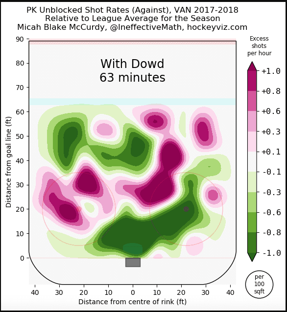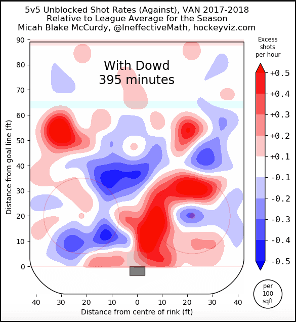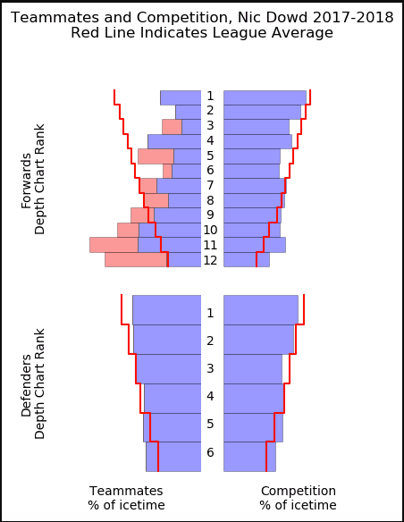 It’d be unfair to discount defensive starts, in which regard Dowd was among the 98th percentile, but high proportions of defensive zone starts aren’t as consequential for on-ice results as one may think.