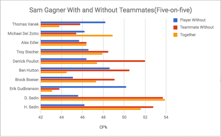 This lacklustre performance trickled down on his most common linemates, with the majority faring better without Gagner on the ice.
