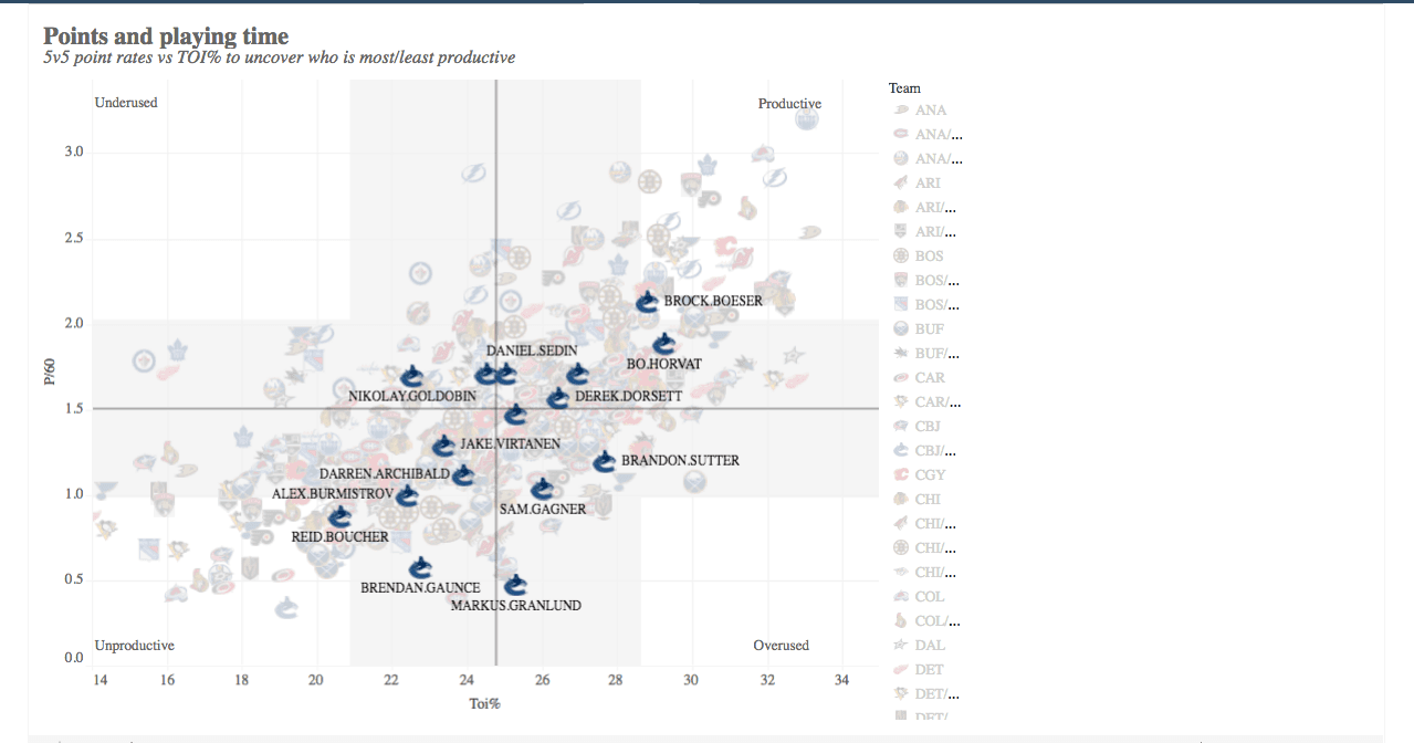 Gagner’s individual expected goals mark has him scoring four more five-on-five goals for the season than the six he actually tallied. The caveat is that Corsica’s expected goals model doesn’t accurately account for finishing ability — part of the reason why we see above average converters like Boeser, Horvat, and Baertschi with goal totals above their calculated marks. The question to ask then is whether Gagner’s mediocre results relative to his expected totals are driven by unfortunate luck or poor finishing ability. As is the case with most of these situations, the truth likely lies somewhere in the middle.