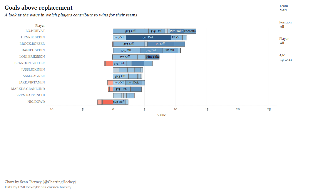 The GAR statistic aims to consolidate performance in all facets of the game, both at even-strength and special teams into a single, composite figure. Baertschi finishes 11th among Canucks’ forwards in contributing a little over three goals relative to a replacement-level player.