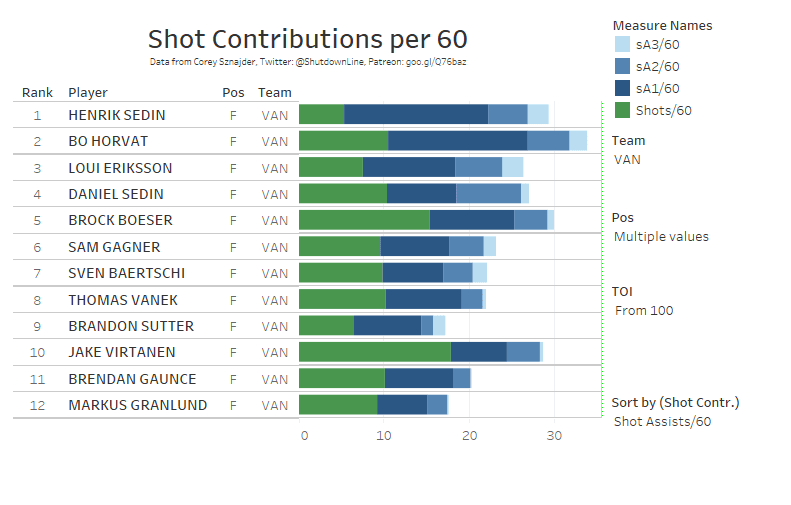 Shot assists are recorded each time a player makes a pass that directly leads to a shot on goal. Baertschi failed to distinguish himself as a marquee playmaker in this sample; finishing 7th on a porous Canucks’ forward group.