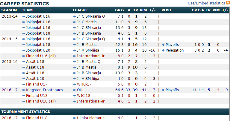 With an Expected Success rate of more than three quarters, Rasanen would seem to be one of the surer bets of the draft. Some of his statistical comparables are inspiring as well, as both Chris Pronger and Brent Burns have worked their way in there, though to be fair, Burns is a bit of a freak: I was surprised to learn that Brent Burns scored just 40 points in his draft year, and defencemen who score 40 points at 17 sure don’t turn into that very often. Nor does Rasanen have the elite eye catching talent that made Chris Pronger a second overall pick before he really became Chris Pronger.