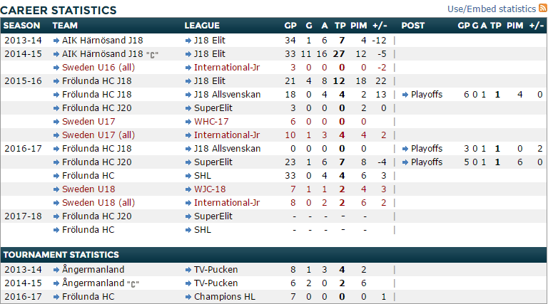 Filip Westerlund is a small, mobile defender who relies on a high level of intelligence and impressive vision to move the play in his team’s favour. He split the season between Swedish junior and professional leagues, but the fact that he appeared in 33 SHL games is an excellent sign given his age. He averaged 11:03 of ice time for Frolunda, which is 6/7th defenceman minutes, and picked up four assists in those games, without much time at all on special teams. He was on the ice for more goals for than against. With 26 shots in 33 games, he generated shots on net at a rate well above average for junior aged players in the SHL, and not that far off of better known prospects like Erik Brannstrom.