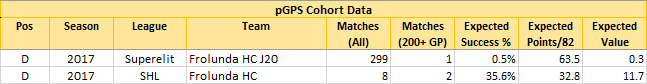 Westerlund’s SHL cohort is a little more positive, and contains long time NHL players Ulf Samuelsson and Tobias Enstrom, as well as recent Canucks experiment Philip Larsen.