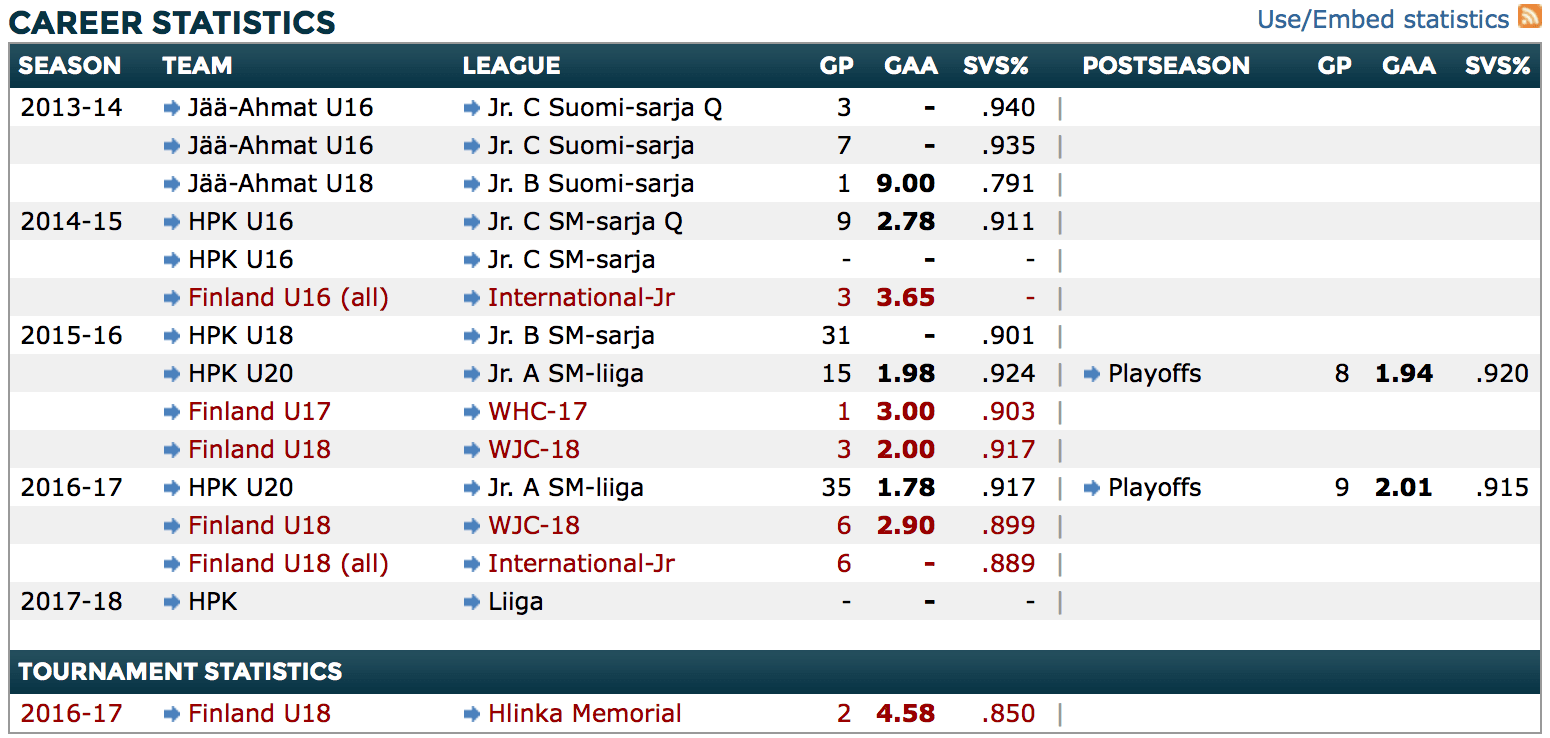 Unfortunately, Luukkonen wasn’t able to replicate his international success during his draft year. Reports of his performances at the 2016 Ivan Hlinka tournament, the 2017 Five-Nations Tournament, and the 2017 U-18’s in Slovakia last month all bore a similar refrain: the talent is clearly there, but the numbers highly disappointing. In each tournament, Luukkonen posted save percentages under .900. Finland’s silver medal at the U-18’s came almost in spite of Luukkonen, rather than as a result of his play.