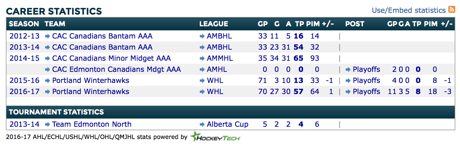 That shouldn’t turn teams out to him entirely though, after all we are seeing more and more small plays succeed in the NHL as speed becomes a defining factor. A quick look through Hughes’ statistical comparables will provide examples of such players, including Tyler Johnson and Tyler Ennis, both of whom Hughes has outscored in the WHL at a similar age.