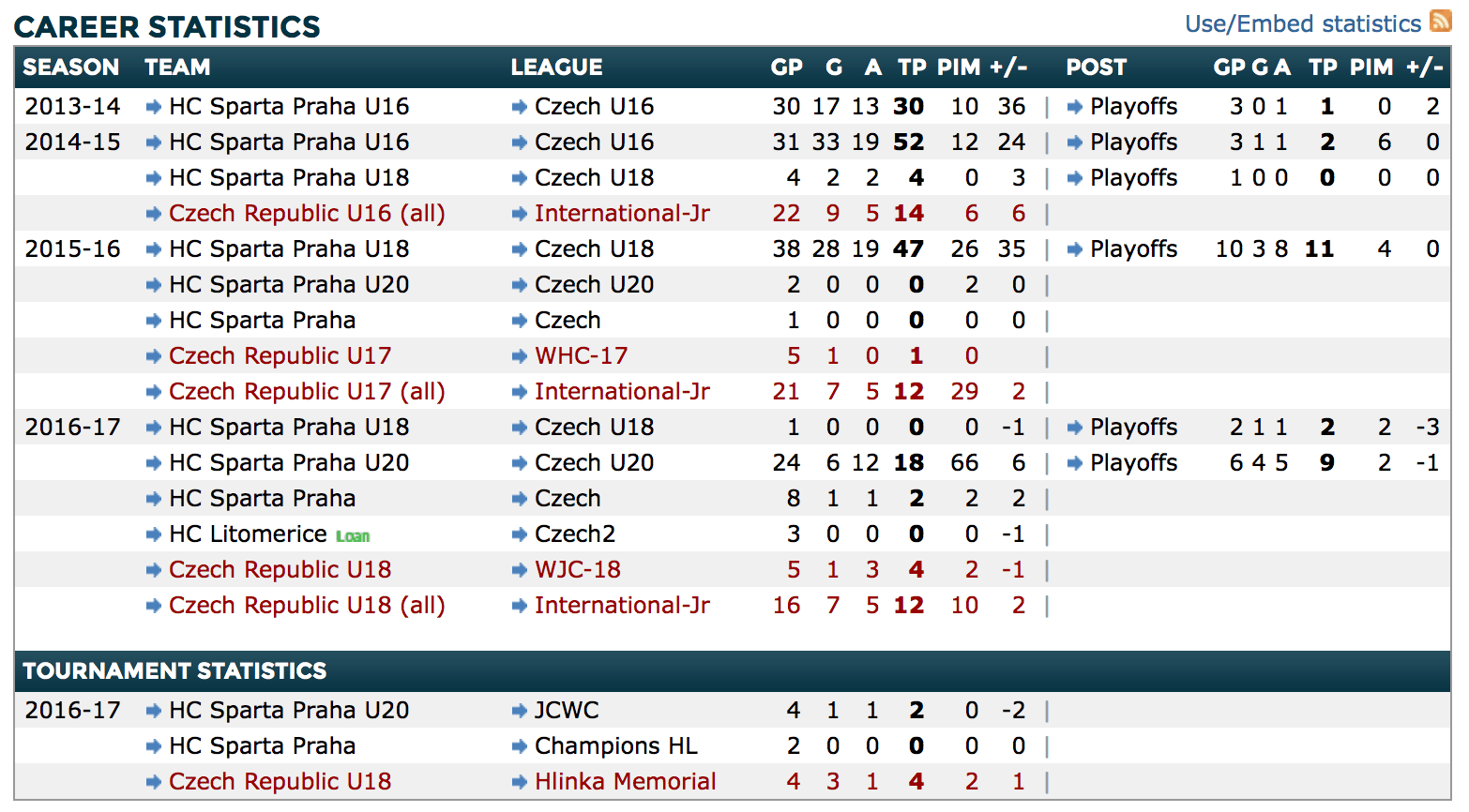 Safin spent the lion’s share of his season in the Czech U20 league, with appearances in both the top tier Extraliga and second tier WSM Liga. In the former league, he managed a goal and an assist in just eight games, which isn’t bad production for a teenager at that level, especially when he was averaging just 6:53 per game. Though it’s a limited sample, his resulting points per 60 at that level were among the best for Under-20 players in the Extraliga, handily beating the point rates of admittedly more established players like Necas and Chytil.