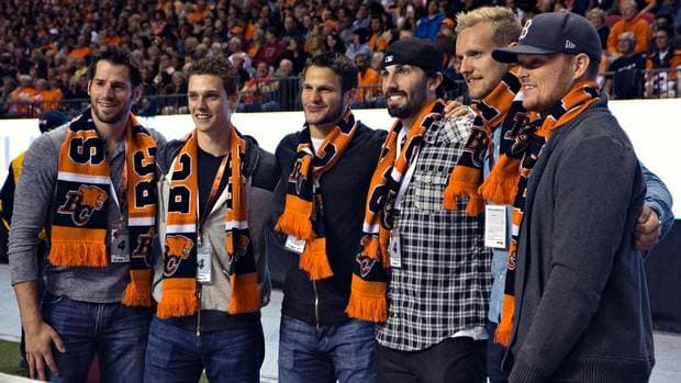 Jason Garrison and Alex Edler (pictured here with their teammates at the BC Lions game earlier this week) aren’t locked out.