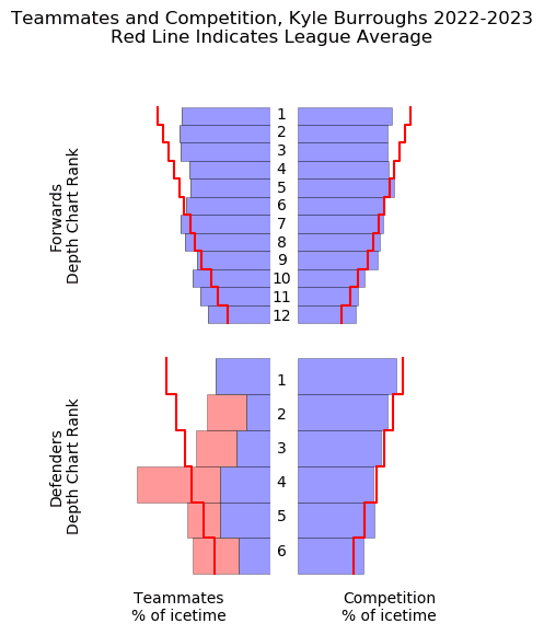 And sure, there’s a quality of ice-time and competition argument to be used against Burroughs when such stats are busted out, but it’s not as strong an argument as one might assume. Burroughs did split his zone-starts almost exactly evenly between the o-zone and the d-zone. And he did it with a competition chart that looks like this…