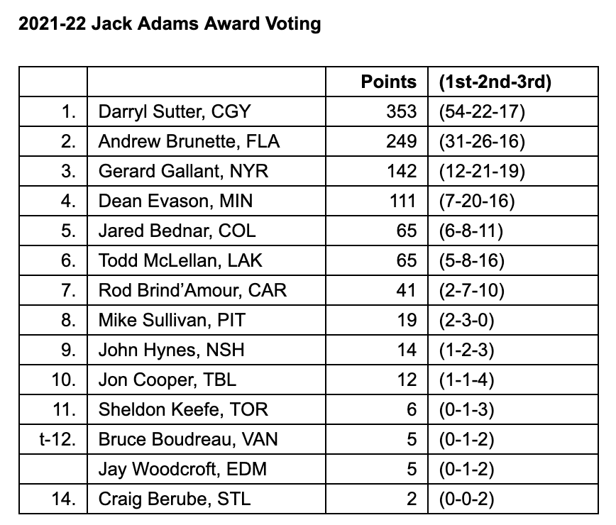 On Wednesday, the full breakdown of votes for the Jack Adams Award, which recognizes the NHL’s top coach, was released.