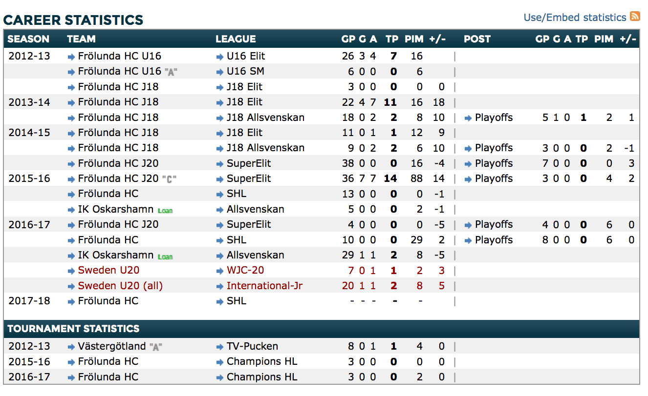 Although many will automatically come to conclusions and deem him a bust, it is encouraging to know that he has a relationship with the Swedish national team. Gunnarsson found himself throughout the lineup at the 2017 World Juniors, from the first pair alongside Anaheim Ducks prospect Jacob Larsson, and all the way down to the team’s seventh defenseman in the bronze medal game.