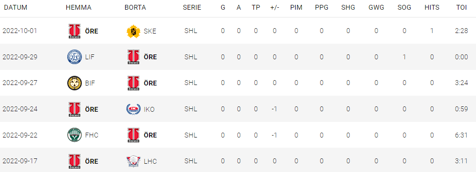 Pettersson has seen one SHL game where he dressed and didn’t get a shift but in most games, he gets a few shifts and possesses a season-high TOI at the SHL level of 6:31.